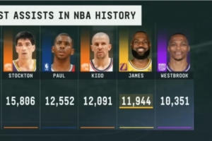 据统计,詹姆斯生涯至今共送出11944次助攻,排名历史第4,距离第三的基德仅差不到150次(147次)。