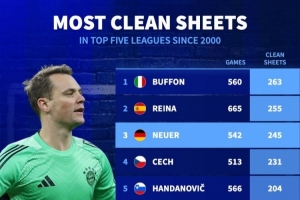 体育资讯3月27日讯 德国转会市场统计了2000年以来五大联赛门将零封场次,并列出榜单,布冯263场居首,雷纳、诺伊尔排名二三位。